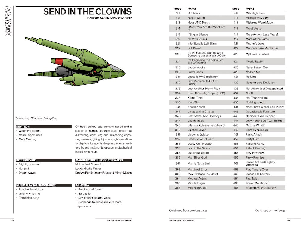 - TABLES! covering everything from ship names and classes, to experimental tech, AI personalities, far-future music genres, and strange robot crews
